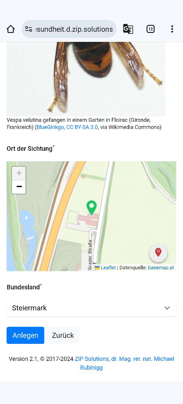 Im Fall einer bestätigten Sichtung von Vespa velutina wird Ihre Sichtung einschließlich Ihrer Kontaktdaten an die zuständigen Landesbehörden weitergeleitet. Dazu müssen wir wissen, in welchem Bundesland die Sichtung gemacht wurde. Grundsätzlich wird diese Information aus der darüber liegenden Karte ausgelesen. Sollte diese Information nicht stimmen, können Sie das Bundesland auch händisch aus der Auswahlliste wählen.